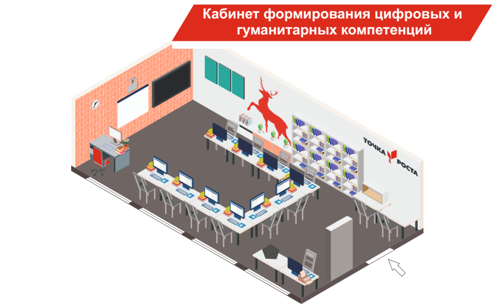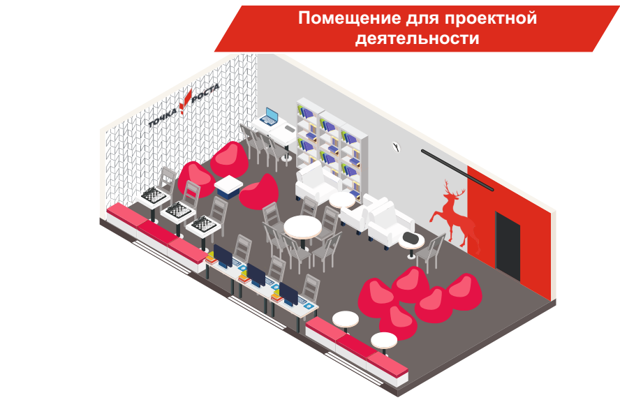 Зонирование помещений в Центре осуществляется с учетом действующих нормативных документов в части требований, предъявляемых к помещениям, в которых осуществляется образовательная деятельность. Зонирование помещений производится согласно современным и актуальным стандартам зонирования общественных пространств (открытые пространства, энергосберегающие технологии, использование возможностей для написания на стенах и др.). Центр Кисловской средней школы расположен не менее чем в двух помещениях общеобразовательной организации площадью не менее 40 квадратных метров каждое и включает следующие функциональные зоны: учебный кабинет по предметным областям «Технология», «Математика и информатика», «Физическая культура и основы безопасности жизнедеятельности»; помещение для проектной деятельности — открытое пространство, выполняющее роль центра общественной жизни образовательной организации. Помещение для проектной деятельности зонируется по принципу коворкинга, включающего шахматную гостиную, медиазону/медиатеку.